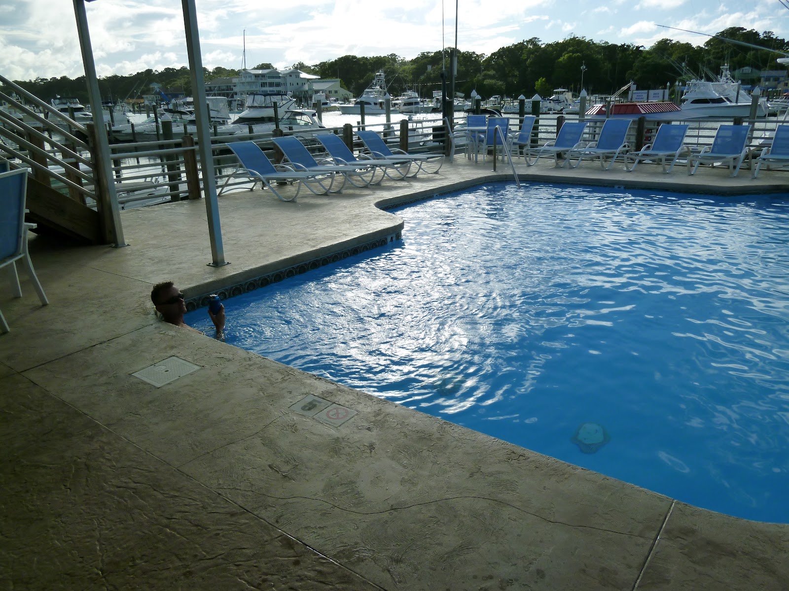 The rest of the trip, being in the ICW, offered very predictable days. Up before dawn, motoring (and motorsailing when possible) southbound for 10+ hours, then docking in the evenings in various marinas along the way. Some days it was blazing hot with little cloud cover, often with hundreds of boats on the water. Other days it was rainy and windy with no other boaters for dozens of miles. Moonshadow II and her fearless (if not eager) crew held up very well, and we all had a pretty good time along the way. We stayed in some great marinas on the way down, with the best being in Coinjock, NC and Myrtle Beach, SC. Great restaurants at each of those places, and the one at Myrtle Beach had a pool with an enjoyable view of the ICW, several nice marinas and a drawbridge.